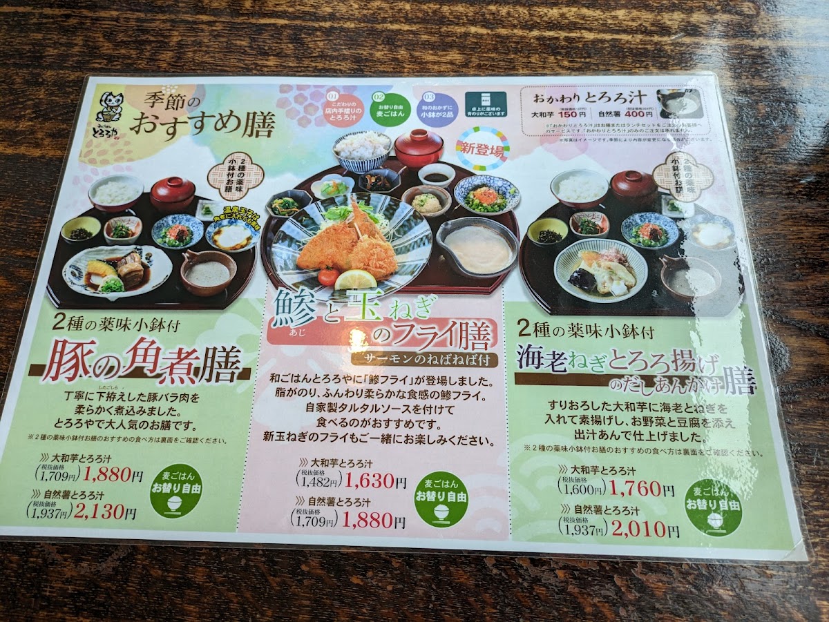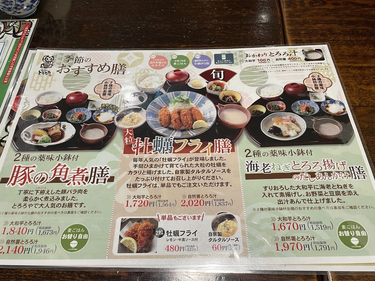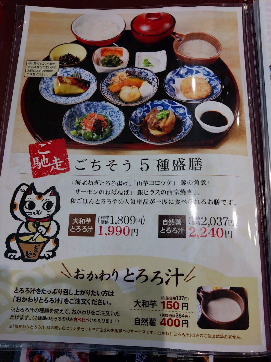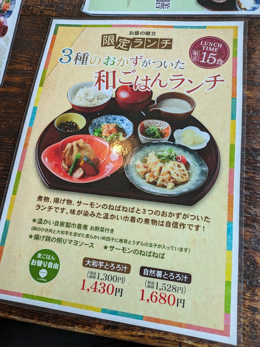 One of the standout items on the menu is the ごちそう5種盛膳 (Gochisou 5-shu Mori Zen), a well-rounded meal that includes a variety of five different dishes featuring tororo, offering an excellent way to experience a diverse range of flavors and textures. This dish, perfect for those who want a little bit of everything, is priced at ¥1,280 (tax included). For a more substantial option, the がっつり3種盛膳 (Gatsuri 3-shu Mori Zen) is a hearty choice, featuring three different servings of tororo-based dishes for ¥1,180 (tax included), ideal for those with a bigger appetite.
